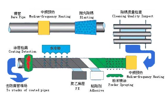 3PE主要指管道有三層PE防腐結(jié)構(gòu):第一層環(huán)氧粉末(FBE>80um),第二層膠粘劑(AD)170~250um,第三層聚乙烯(PE)1.8~3.7mm。三種材料融為一體,并與鋼管牢固結(jié)合形成優(yōu)良的防腐層。